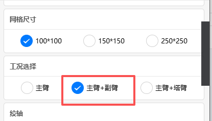 完成障碍物设置后,选择“副臂工况”,依次录入吊车的核心工况参数:主臂长度46米、副臂长度16米、副臂安装角度30度。系统会根据录入的参数,自动匹配对应的吊车作业工况模型,无需手动调整复杂参数。