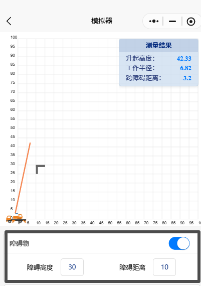 打开吊臂计算器后,直接进入“吊臂模拟”模块。首先设置障碍物参数——这里的障碍物高度就是楼高,输入30米;障碍距离指的是吊车回转中心到楼边的距离,根据现场情况输入10米。