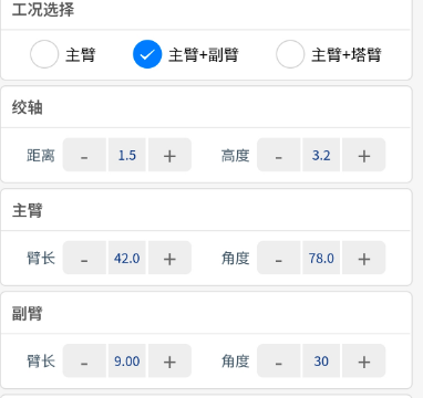 先选择副臂工况,按照现场实际参数依次输入:主臂长度42米、副臂长度9米、副臂安装角度30度。