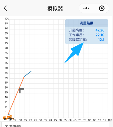 在模拟界面中,慢慢调整吊臂角度(也就是“趴吊臂”),直到吊臂刚好紧贴设置的“楼高障碍物”。此时查看界右上角显示的“跨障碍距离”,这个数值就是物料从楼边能安全吊运进楼内的最大距离!